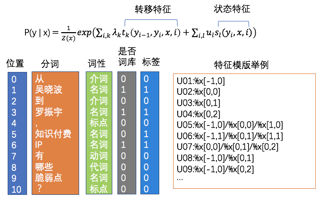 tag抽取是一种典型的序列标注任务。我们尝试了经典的CRF(条件随机场)模型,特征包括字+词性+分词边界+特征词+词库,词库包括人名,地名,机构,影视,小说,音乐,医疗,网络舆情热词等词库。特征收集好之后需要配置特征模版,特征模版需要配置同一个特征不同位置组合,同一个位置不同特征组合,不同位置不同特征组合,特征模版70+。虽然CRF相比无监督方式效果比较好,但是特征工程复杂,面向新的数据源需要大量工作调节特征。