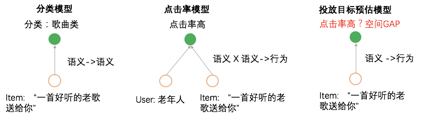 我们要解决的问题就是给定item,预估试探等级。目标就是减少投放目标预估的点击率与实际投放点击率的差距。评价使用MAE,hitrate5%,hitrate。分类模型是从语义到语义的映射,点击率模型是从user叉乘item到行为的映射,而我们要构建的模型是从语义到行为的映射,这里如何减少映射空间的GAP是难点。