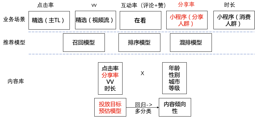 对于外部内容,例如UGC等,需要系统给予内容一定量的曝光,目的是挖掘其中的优质内容,召回和排序模型学习到优质内容之后会进行正常的分发,这就是内容试探过程。然而试探流量有限,新内容过多,如何预估内容试探的优先级是一个重要的问题。我们基于内容投放目标模型对新内容打分,优质分高的内容曝光优先级越高,并且针对不同的场景使用不同的投放目标,比如小程序使用分享率、精选视频流使用vv、精选主TL使用点击率,从而提升系统挖掘爆款的能力。