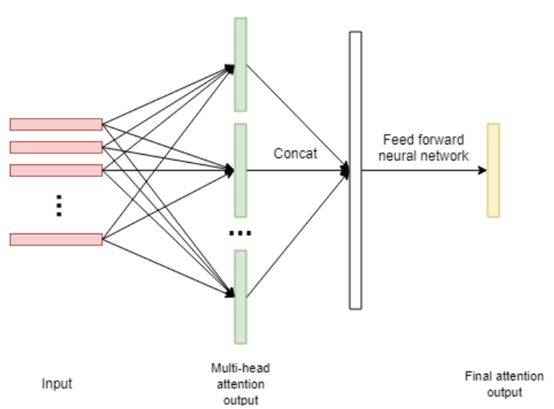 引入 Attention 机制是为了让 Decoder 在生成一个文字的时候能够在输入序列中定位到最相关的信息,也就是说 Attention 机制其实是一种对齐模型(Alignment Model),它通过打分来评估 i号输出与 j 号输入间的匹配程度。但传统的 Attention 机制存在一个问题,当输入序列的长度、尺度或分辨率发生变化时,这种 Attention 方法就会发生定位错误,进而引起误识别;而 Multi-head Attention 可以很好地解决这个问题。Multi-head Attention 的基本思想是使用多个 Attention 模块分别聚焦图像的不同部位,然后再将这些不同模块的结果整合起来,从而达到更加准确聚焦单个文字的目的。其结构如下图所示: