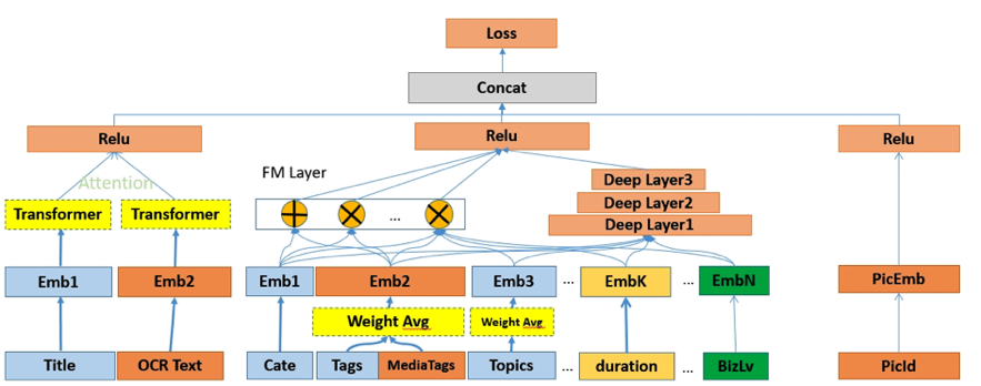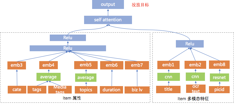 起初我们使用DNN快速构建模型,特征包括:1.文本属性 (标题、类目、主题、Tag等) 2.图像属性 (封面图、OCR) 3.固定属性 (发布时效、视频时长、是否优质) 4.发布者属性: 1.ID信息 (ID、媒体等级) 2.文本属性 (名称、类目)。除此之外,我们还引入cnn对标题和ocr text做理解,使用resnet对视频封面做理解。最终通过self attention将多路channel进行融合,最终输出投放目标。