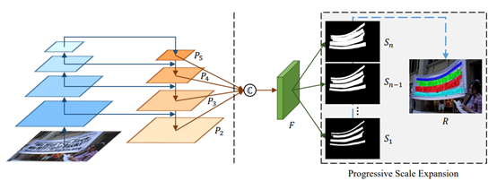 如上图所示,PSENet 采用 FPN 作为主干网络,图片 I 经过 FPN 得到四个 Feature Map,即P2、P3、P4 和 P5;然后经过函数 C 得到用于预测分割图的 Feature Map F。基于 F 预测的分割图有多个,对应着不同的覆盖程度,其中 S1 的覆盖度最低,Sn 的覆盖度最高。