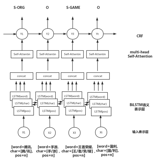 我们将推荐实体识别算法从匹配升级到BiLSTM-CRF with Attention架构的多类别实体联合识别模型。模型主要采用字、词、词性三种特征,在BiLSTM层与CRF层间引入multi-head self-attention层,在多个不同子空间捕获上下文相关信息,筛选不同类别实体的重要特征,增强特征对实体类别分辨能力,进而提升模型识别效果。最后使用CRF进行标签序列建模,利用全局信息,将标签转移矩阵作为标签序列的先验知识,