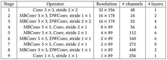 特征提取网络是基于 EfficientNet 改进的,网络的详细结构参考下表: