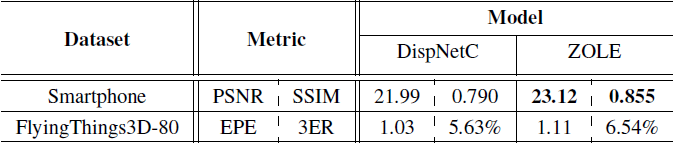 表2展示了立体匹配的定量分析结果。由于自行采集的人像数据并无真实的视差图信息,本文先计算视差图,并用其及辅图合成出一张左图,然后计算合成的左图与真正的左图的PSNR和SSIM,以此估量自适应训练后的立体匹配神经网络在新场景下的性能(如表2所示),可见本文提出的方法在两项指标上均大有提升。