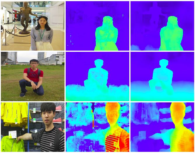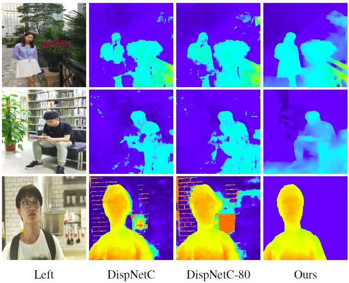 下面展示将在FlyingThings3D数据集(计算机合成数据)上训练的立体匹配网络自适应到人像场景中(如图5所示),可见相比起原来的网络,经过自适应训练后的网络在人像数据上能产生更准确的视差图及更丰富的细节。