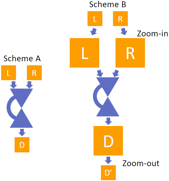 导致该现象的原因是,将输入图像放大等价于让立体匹配算法在亚像素的精度下进行匹配(更高的颗粒度),于是能产生更多的高频细节;然而,神经网络等价的感受野也会相应变小,换句话说,网络变得相对“短视”了,因此当r达到一定数值后,匹配精度开始变差。