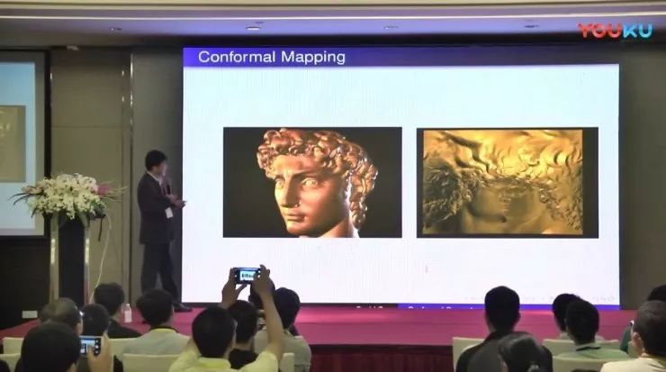这张图显示的就是共形变换的第一个优点,就是降维,把三维变成二维。大家如果对硬件比较熟悉的话,图像处理可以用 FPGA 来做、用 GPU 做,但是处理三维曲面比较困难。比如大家想把 CNN 从图像处理变成几何处理,有几种方法,一种是把曲面嵌在八叉树里;另一种就是展在平面上,然后用平面处理的方法来做。今年 SIGGRAPH 就有这方面的论文。把三维曲面变成二维,最自然的方法当然就是这种共形变换。