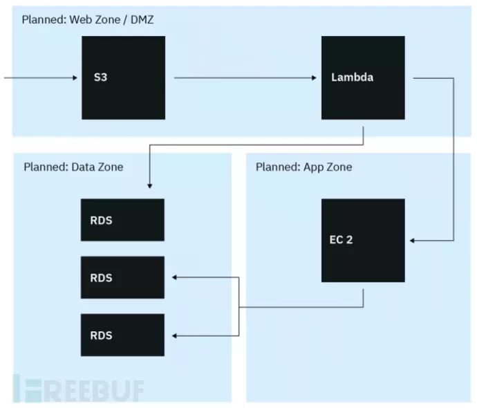 假设在aws上运行的示例应用程序有四个组件:s3内容、lambda、在ec2实例上运行的自定义数据处理组件和几个rds实例。它们反映了三个网络分割区域:web、应用程序和数据。