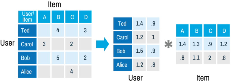 下一个有趣的算法是矩阵分解。这是一个非常优雅的推荐算法,因为使用矩阵分解时通常不用考虑要在结果矩阵的列和行中保留的物品。
