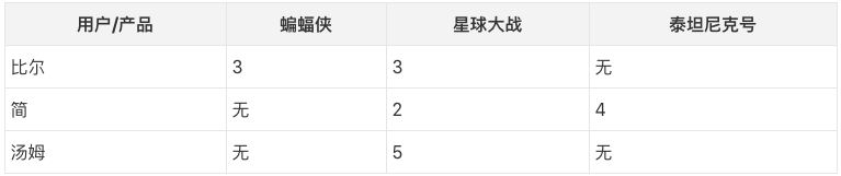 例如,如果我们想比较比尔和简,我们可以看到,比尔还没有看过《泰坦尼克号》,而简到现在为止还没看过《蝙蝠侠》,所以我们只能通过《星球大战》来衡量他们的相似性。怎么会有人不看《星球大战》,是吧?:)
