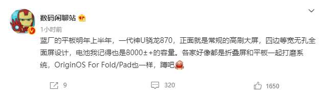 @数码闲聊站 今日爆料,vivo 的新平板将于 2022 年推出,搭载一代神 U 骁龙 870,将配备 8000mAh 电池。他表示,vivo 的新平板正面采用四边等宽无孔全面屏设计,为常规的高刷大屏。各个厂商都是同时开发折叠屏手机和平板的系统,vivo 新平板的系统和 OriginOS For Fold 类似。