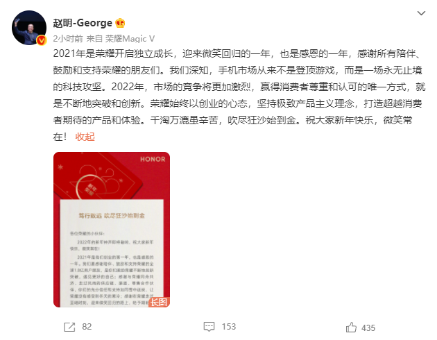 荣耀 CEO 赵明今日在微博发表总结信,他表示,荣耀首款折叠屏旗舰 Magic V 将在 2022 年 1 月和大家见面。手机将在形态、性能和交互三个维度,实现革命性的突破。此外,手机将搭载荣耀自研,行业最薄铰链专利技术,为消费者提供最实用的折叠屏解决方案。官方在文中透露,荣耀 Magic UI 6.0 系统也将随 Magic V 一同发布。荣耀将由此起步,以打造比肩和超越 iOS 的体验和产品作为奋斗目标。