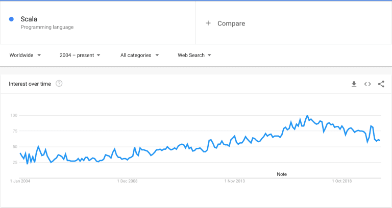 举例来说,我们看一下 Scala 语言,自 2009 年以来,Scala 变得越来越受欢迎,开发人员欢迎这种新的函数式风格,它能够让他们的编码更灵活,也能安全轻松地编写出并行代码。我们可以在下面的谷歌趋势图中看到这个趋势: