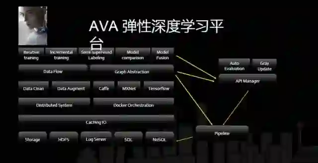 训练的过程还有一块是 Pipeline,这个 Pipeline 其实是对日志做迭代收集,做 transform,到不同的存储结构上,这些可能是一些图像的标签,视频的标签这些内容,这就是我们整体的 AVA 平台的架构。