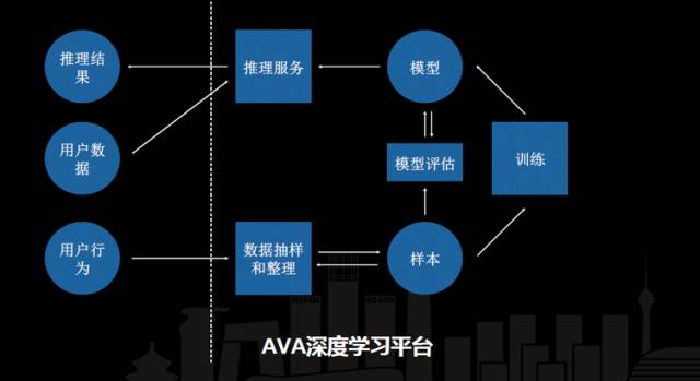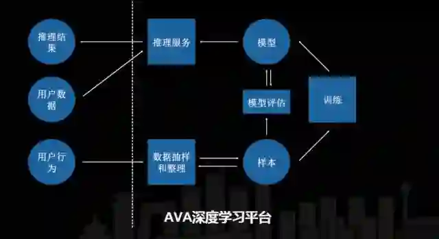 训练集群完成后会生成线上的模型,我们的样本集也会有一部分持续投到模型评估的模块里,模型会根据一套 API 生成器自动上线到推理服务上。最后利用用户数据去访问推理服务,会得到相应的推理结果,这是比较简单的 AVA 的一个基本逻辑。