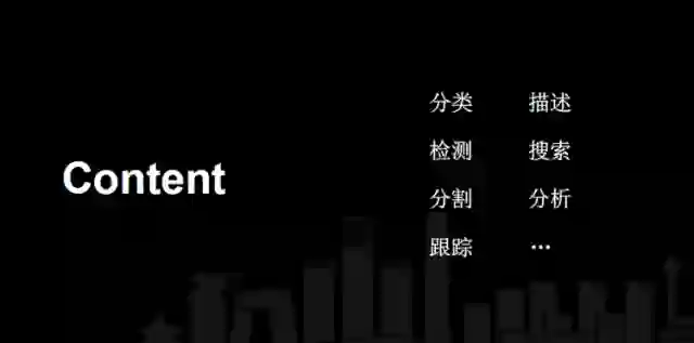 我们怎么理解这个内容。首先我们可以去把内容解析成很多目的。第一个是分类,分类是基本内容的解析,比如判别这个图片是不是黄色图片。第二个就是检测,比如检测这个视频里面有没有人脸,这些人脸是谁,里面出现了哪些物体,有没有车,车的型号是什么。还有分割,比如说一个画面里面,这个人的形状是怎样的,他跟背景的界限在哪里,这就是一个很简单的分割问题。然后就是跟踪,比如说一个视频中,我们有人脸在走动,这就是一个跟踪问题。以及一个视频的描述,一个视频每一段里出现了什么事件,每一段里面有多少人物,这些是一个描述。还有搜索,我看了很多图片之后搜关键的信息出来,再之上可能就是分析,还可能做很多的处理。