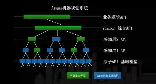 Argus 系统最底层是通过 AVA 训练出来的原子 API,有了原子的 API 之后上层是感知层,感知层会做基于原子 API 的抽象做一些复杂任务,比如聚类。再之上是一些高级的任务,最后是一些与视觉相关的综合 API,再往上是业务逻辑大数据分析,在 Vision 层我已经不管了,我把这个东西扔到抽象层结构化数据,或者说 vision 跟语言相关的加了一些 RNN 把语意描述出来之后就扔给业务逻辑处理了。所以现在 API 的 framework 整体设计成这个样子。设计成这套系统后,有很多是我们新研发的,Argus 系统现有的是蓝色的,原子 API 是通过 AVA 训练出来的,AVA 还没有公开,原子的基础视觉 API 都是我们自己研发的。我们希望之后跟大家公开用 AVA 训练出来的特定的一些识别模型。我们也在尝试性地找一些想做这个事情的长期合作伙伴。