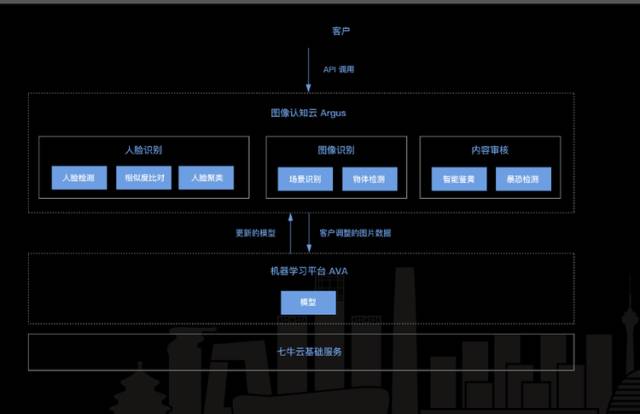 这是我们现在整体上 Argus 的图像认知,有很多基础服务,包括一些业务层的比如人脸检测、相似度比对、人脸聚类、鉴黄、暴恐,这些基础的模型之下,有一个一直在迭代运算的 AVA 深度学习平台,它一直不停地产出一些基础的原子 API 给 Argus 系统,Argus 系统跟客户走得更近,让客户可以自己在 Argus 上编 Docker 镜像,load 上来,一起完成智能的任务。