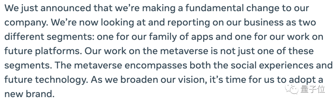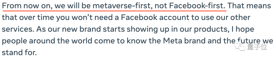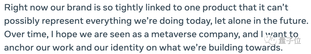 现在我们的品牌与一个产品紧密相连(指Facebook),但它不可能代表我们现在所做的一切工作,更不用说未来了。随着时间推移,我们更希望被看作是一个元宇宙公司,我希望我们的工作和身份被锚定在我们正在做的东西上。