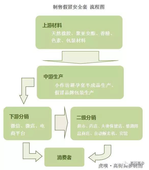 根据这些制售假冒避孕套的嫌疑人供述我们绘制出如下的制售流程图: