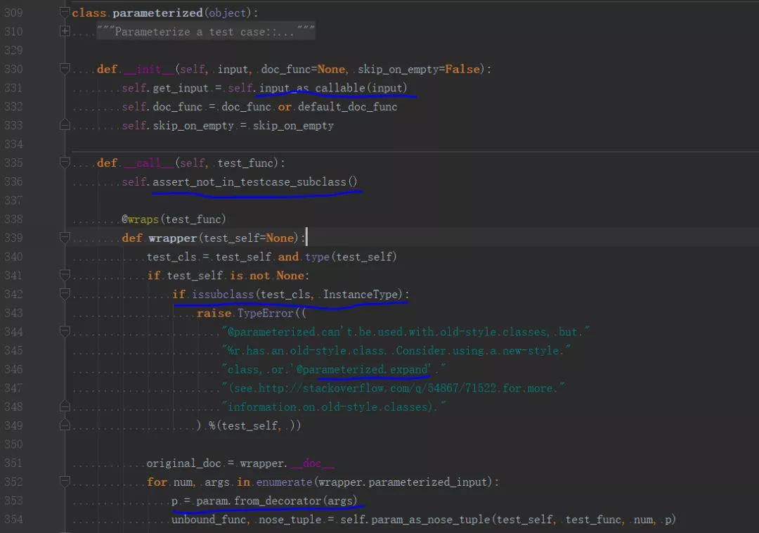 它提供了一个装饰器类 @parameterized,源码如下(版本 0.7.1),主要做了一些初始的校验和参数解析,并非我们关注的重点,略过。