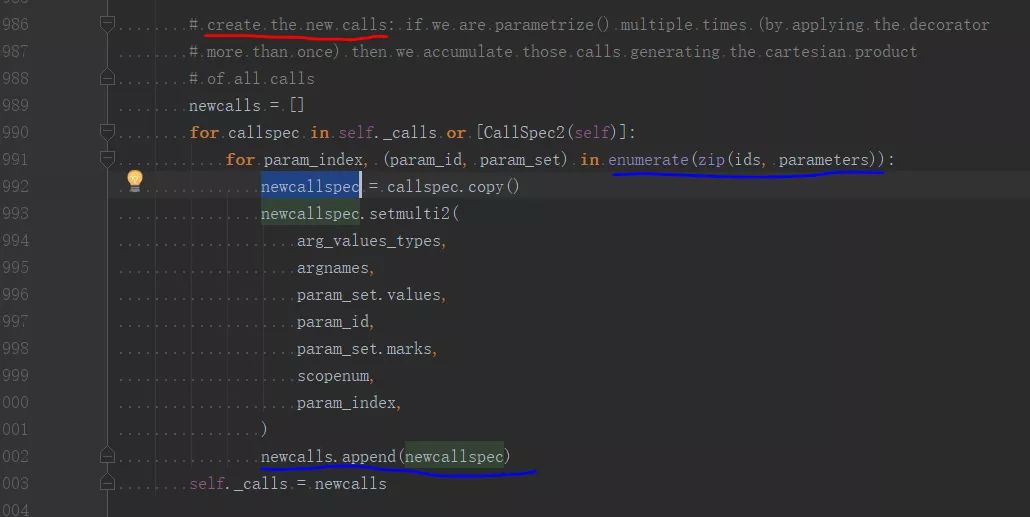 根据传入的参数对,它复制了原测试方法的调用信息,存入待调用的列表里。跟前面分析的两个库不同,它并没有在此创建新的测试方法,而是复用了已有的方法。在 parametrize() 所属的 Metafunc 类往上查找,可以追踪到 _calls 列表的使用位置: