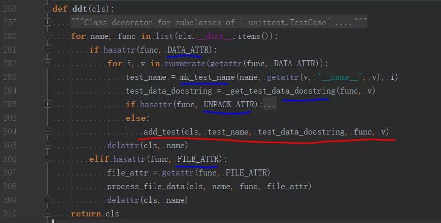 它们的共同作用是在类方法上 setattr() 添加属性。至于这些属性在什么时候使用?下面看看加在类上的 @ddt 装饰器源码: