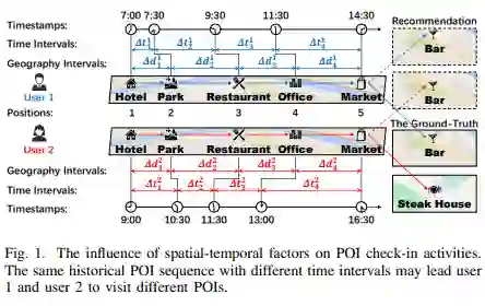 如图所示,如果一个序列模型在建模时仅考虑 POI 和空间信息,则 Fig. 1 中 user 1,user 2 的历史序列在隐空间中的表示会高度相似,并导致有偏差的推荐结果。