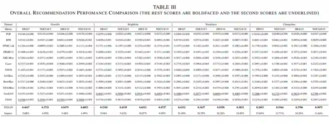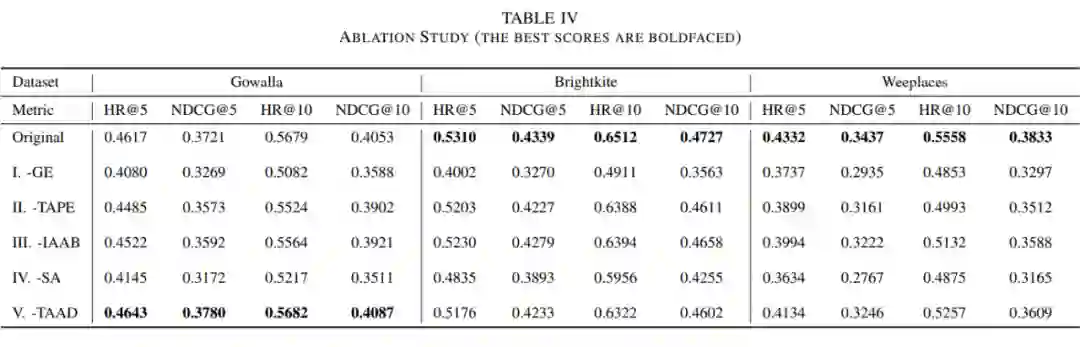 本文在 3 个公开 LBSN 数据集和 1 个真实世界城市交通数据集上进行了大量实验,结果表明 STiSAN 相较于多个 SOTA 模型可以取得 13.01% 的推荐精度提升。消融实验,指标评估以及可视化实验分别验证了 TAPE 和 IAAB 的有效性、可拓展性、可解释性。