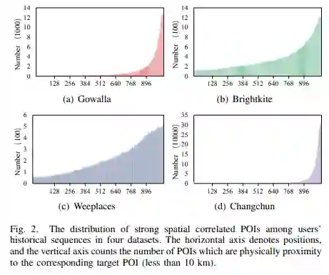 如 Fig. 2 中所示,具有强空间相关性的 POI 在历史序列的短期 check-in 和长期 check-in 中均有分布。但是由于上述 SAN 本身的结构特性,其无法充分考虑这些 POI 之间的空间相关性,并由此导致推荐精度受限。