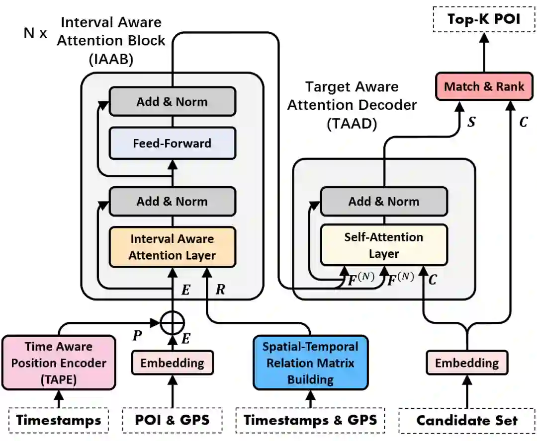本文将 TAPE 和 IAA 应用于自注意力网络(SAN),提出了一个端到端的时空间隔感知的序列 POI 推荐模型 STiSAN,以此来实现细粒度的偏好建模以及提供可解释的推荐结果。