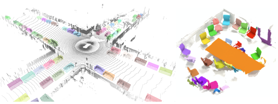 下图(左)为 TF 3D 库中 3D 目标检测模型在 Waymo Open 数据集帧上的输出示例;下图(右)为 TF 3D 库中 3D 实例分割模型在 ScanNet 数据集场景上的输出示例。