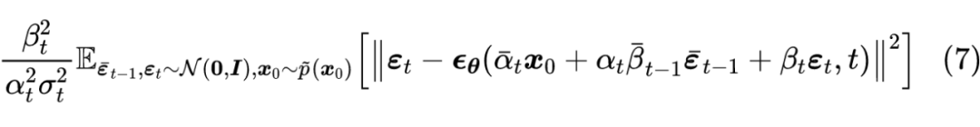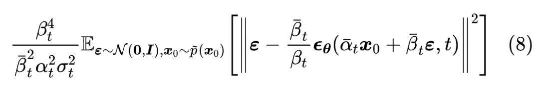 这就得到了 DDPM 的训练目标了(原论文通过实验发现,去掉上式前面的系数后实际效果更好些)。它是我们从 VAE 的优化目标出发,逐步简化积分结果得到的,虽然有点长,但每一步都是有章可循的,有计算难度,但没有思路上的难度。