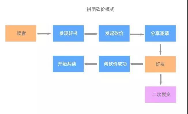 在流量获取上,拼多多、小游戏做了许多裂变活动,蜗牛共读也尝试用“砍价”模式拉动用户增长,用户看到自己想要阅读的书后,可以邀请好友帮助砍价,砍价金额随机,砍到0元即可免费阅读,“拼砍价”具有很强的社交属性,基于微信熟人关系链,抓住用户“贪”和“帮助”的心理完成快速的用户增长。