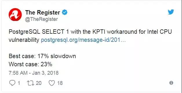 此外,由于漏洞是硬件设计导致的,无法使用微码修复,只能进行 OS 级的修复,而 OS 级的修复会导致严重的性能问题,可能会有 5%-30% 的性能下降。有网站对此事进行了初步测试,证实一些 CPU 执行 IO 密集型任务的速度下降了 18%,不过 Linux 下的游戏性能没有受到影响。