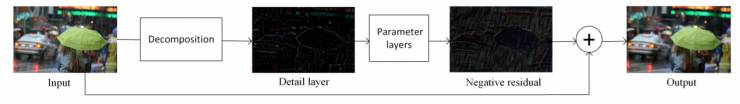1、类似ResNet的思路,回归带雨图像与原图的残差,而不是直接输出还原图像。这样一来可以使算法操作的图像目标值域缩小,稀疏性增强。实际上这一点在超分辨率等很多问题中已经被广泛应用。
