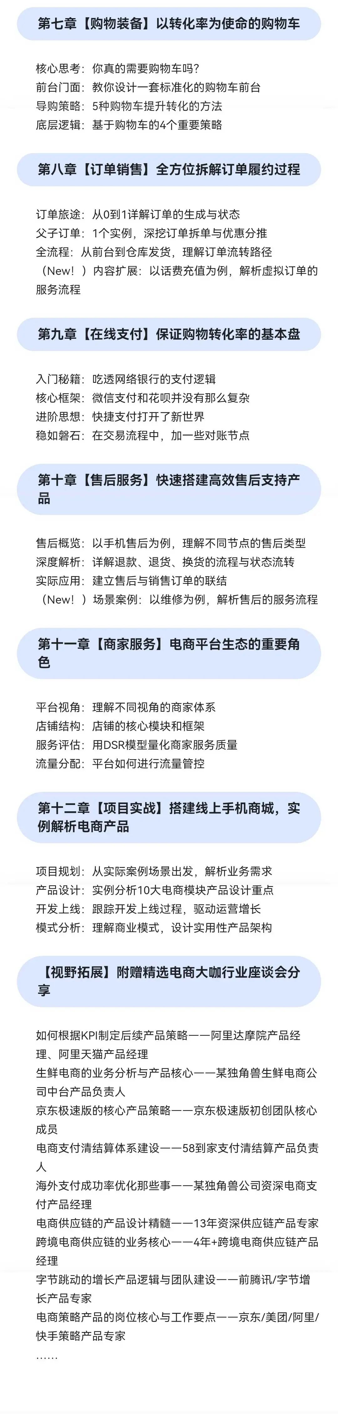 课程将从实战出发,通过 1 套电商体系课、48 场专项直播,8 次实操作业、1 个实战项目,365 天导师伴学,帮助 0-3 岁电商产品经理,系统掌握大厂规范的电商产品核心能力,成为有思考、有策略的高薪电商产品经理。