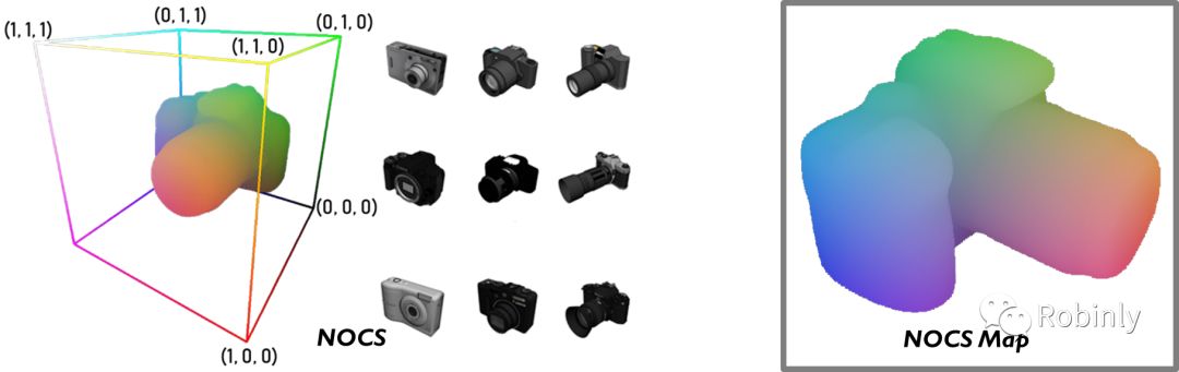 我认为我们的主要贡献有点。第一个是我们提出了归一化物体坐标空间(NOCS)这种新颖的表征方式。我们试图找到物体的位置,解决实例分割问题,同时估算出 3D 物体大小和 6D 姿态。我们需要一种表征方法将问题统一解决。所以我们提出的核心概念就是对物体的坐标同时进行大小和姿态上的归一化而得出这样一个表征。