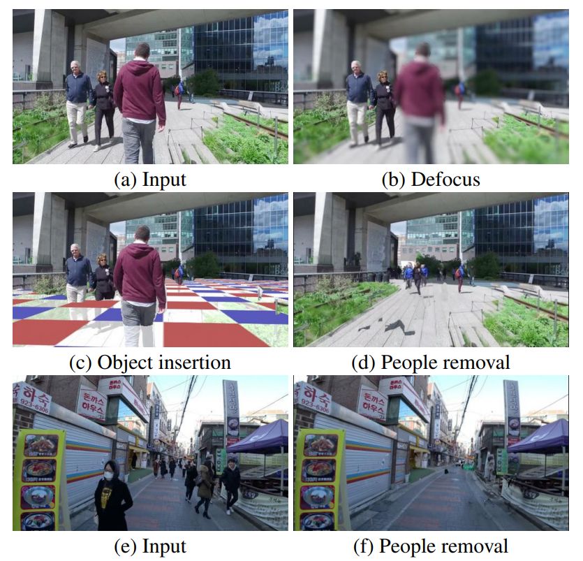 我们的深度预测方法还可以应用于增强现实下的各种视觉效果中,比如视频散焦和对象插入,甚至当人和摄像机同时移动时,还能够将人物从场景中移除。