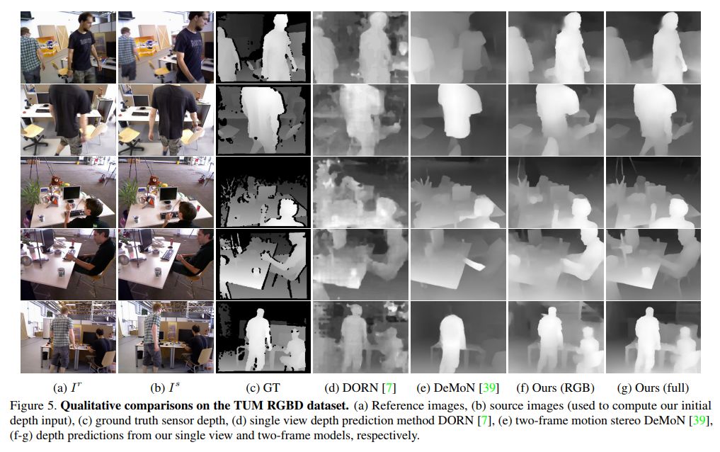 我们在不同的数据集上测试了这个方法。在 Mannequin Challenge 测试数据集上,我们把完整的模型与只包含 RGB 的单视图深度预测方法进行了比较。结果表明,与单视图深度预测基线方法相比,我们提出的模型能够获得更准确的深度预测结果。在标准TUM RGBD 数据集中,我们测试了摄像机和人物在同一场景中同时移动的情况,还和其他最前沿的移动立体视觉算法,比如 DeMoN,以及单视图深度预测方法 DORN 进行了比较。这些结果都证明了我们的完整模型可以利用刚性场景的运动视差进行预测,其结果明显优于其他基线方法和前沿方法。跟从传感器中获取的真实信息进行定性比较后也可以发现,我们在有人和无人的场景中所获得的结果都比前人所提出的方法要准确得多。