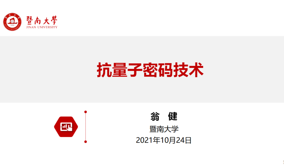 接下来,暨南大学副校长翁健教授在线作了题为“抗量子计算密码技术”的分享。翁健教授首先介绍了量子计算机对公钥密码学和对称密码学的安全性影响,以及当前密码学界在研究的可以抵抗量子计算机攻击的几种主流密码技术,侧重介绍基于格的密码技术的研究进展。他还分享了抗量子密码技术的标准制定情况,并对抗量子计算密码技术的前景进行展望。