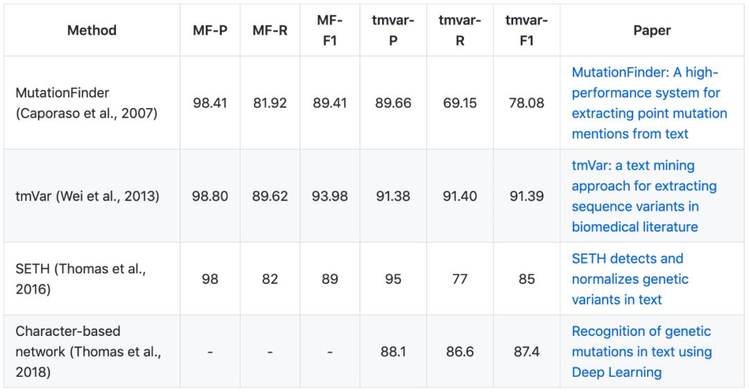 MutationFinder: a high-performance system for extracting point mutation mentions from text. Caporaso J G, Baumgartner Jr W A, Randolph D A, et al. Bioinformatics, 2007, 23(14): 1862-1865.