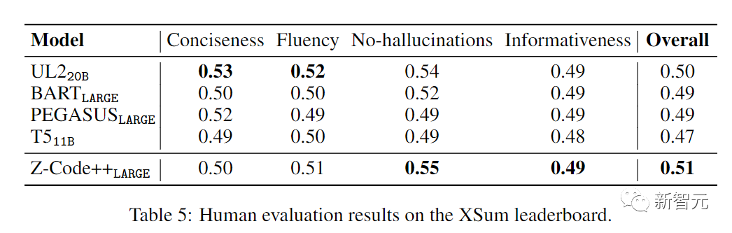 在XSum排行榜进行人工评价后,Z-coder++仍然从整体上来看是最高分,达到0.51