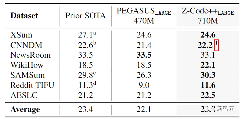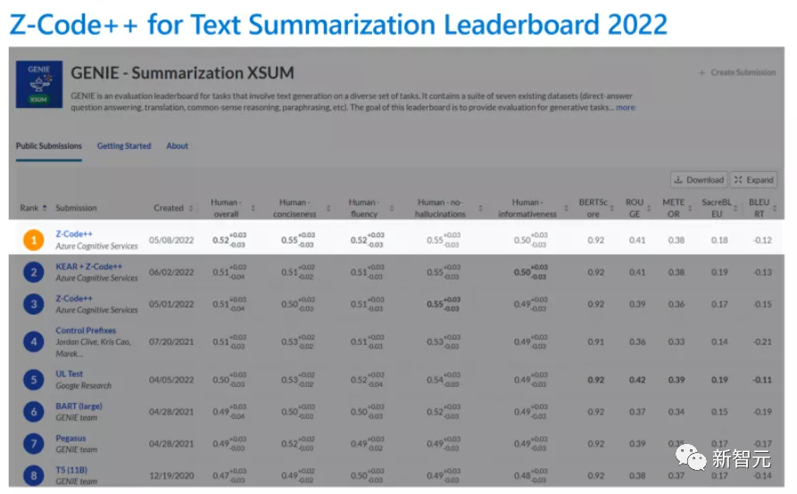 鉴于Z-Code不俗的表现,开发团队又进一步将Z-Code升级拓展为Z-Code++,使其可以完成文本摘要任务,并在GENIE benchmark上取得了第一名的好成绩。