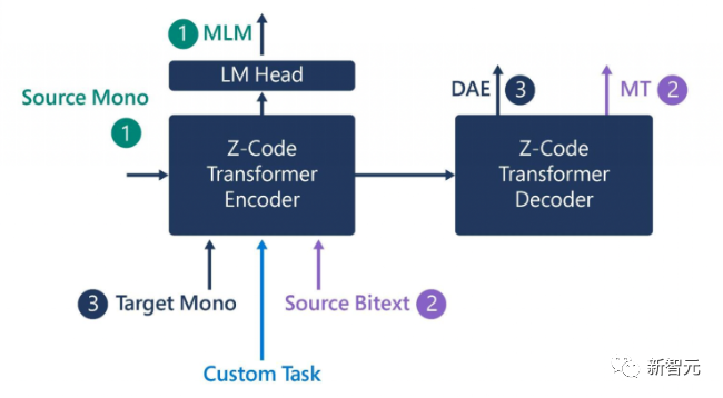 Z-Code的基本思想很直观:与传统的神经机器翻译方法不同,Z-Code不仅使用多语言的数据在机器翻译任务上进行训练,同时使用单语言数据作为补充,在掩码语言模型(MLM)任务上训练。使用多任务学习,同时优化多个目标函数。模型结构使用标准Transformer的编码器和解码器。