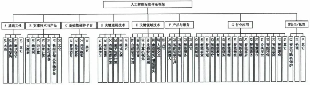 人工智能标准体系结构包括“A基础共性”“B支撑技术与产品”“C基础软硬件平台”“D关键通用技术”“E关键领域技术”“F产品与服务”“G行业应用”“H安全/伦理”等八个部分,如图1所示。