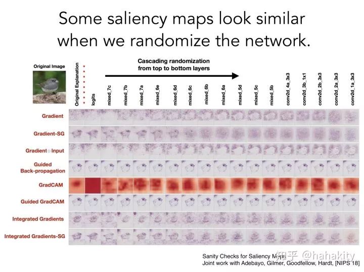 最近 MIT 的 Been Kim 给了一个关于深度学习可解释性的报告(报告链接:https://drive.google.com/file/d/1ACMlhSIC-tAnpRVYu-Epl0lWfOOtNvF1/view)。报告里有一张让人非常震惊的图。下面这张 Slides 讲就算将神经网络的参数随机处理,目前市面上的大部分神经网络解释器仍然给出看上去相似的关注图。也就是说虽然看上去解释器找到了输入图片中的重要区域,但这并不解释神经网络学到了什么,就算是随机网络,解释器也能找到这些区域。