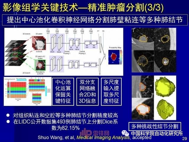 分割,一般可能需要医生先进行勾画,然后可以用机器学习的方法进行半自动或者全自动的分工,这个分工效果也可以达到主治医生的水平,一系列方法不展开说,其他还包括肺癌等等。