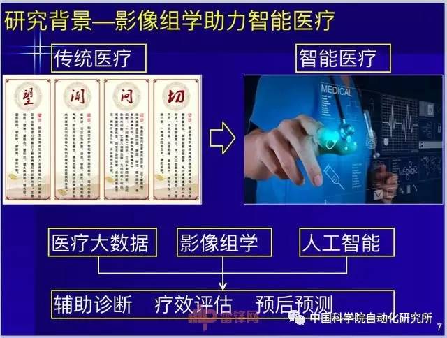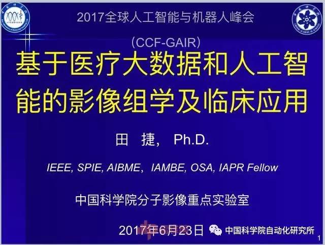 7月9日,在由中国计算机学会(CCF)主办,雷锋网、香港中文大学(深圳)联合承办的CCF-GAIR 全球人工智能与机器人峰会的第三天,在未来医疗专场上,自动化所田捷研究员做了“基于医疗大数据和人工智能的影像组学及其应用”的主题演讲。